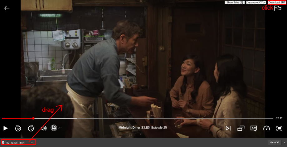 Nếu bạn đang xem phim trên các trang streaming khác ngoài Netflix hoặc Youtube thì sau khi tải những sub trên các trang như kitsunekko về thì sẽ có khả năng file sub và video sẽ không đồng bộ. Nếu bạn muốn nó chạy khớp thì bạn có thể đúng Ctrl- Trái/Phải hoặc Shift-Trái/Phải để chỉnh sub thành câu tiếp theo hoặc câu phía trước trong khi video vẫn đang chạy bình thường.