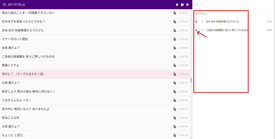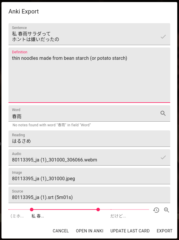Bấm vào nút thì sẽ đó nó sẽ hiển thị ra những câu sub đã được lưu. Bấm vào dấu ngôi sao bên cạnh chúng thì hộp thoại Anki sẽ được mở ra.