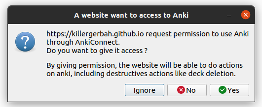 Lúc này web sẽ kết nối với Anki qua AnkConnect, nó sẽ mở hộp thoại như hình dưới. Bấm Yes để cho web quyền dùng AnkiConnect.